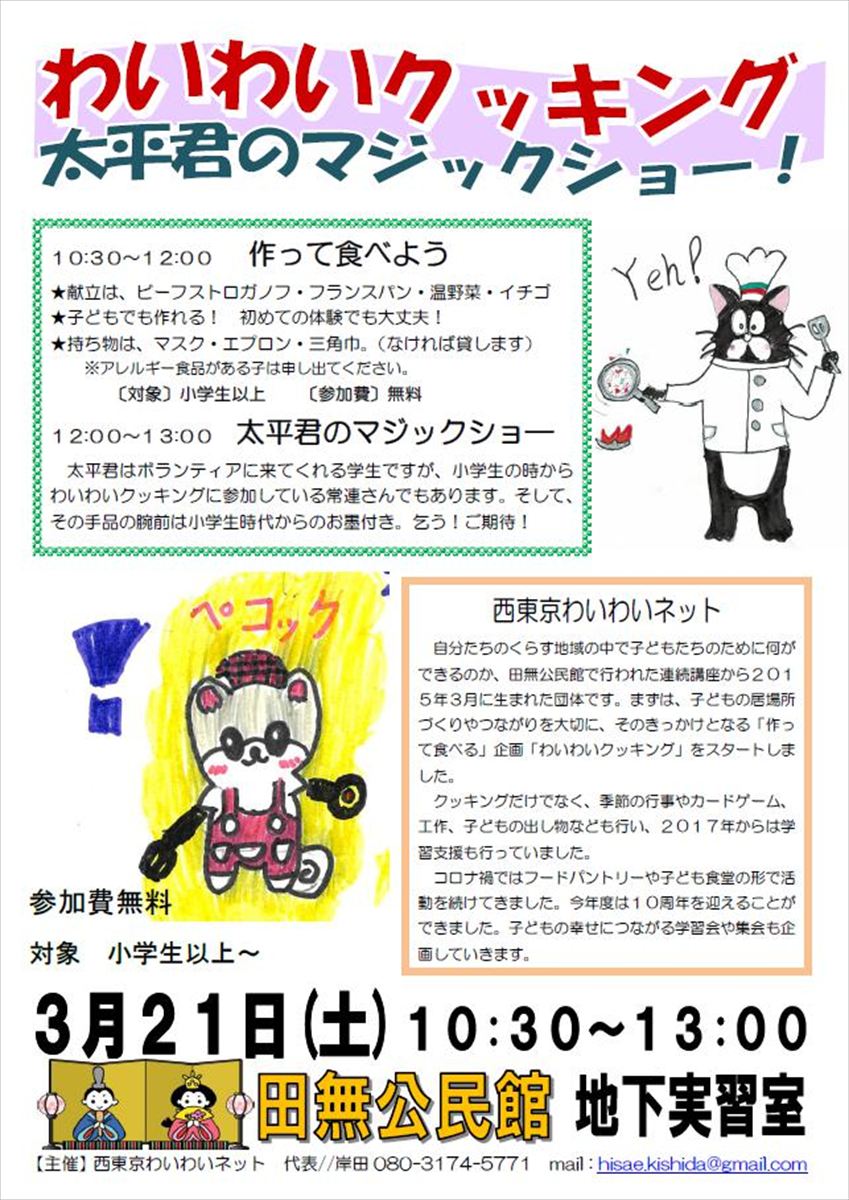 次回は、3月21日(土)10:30~13:00に開催します。 クッキングのあとは、太平君のマジックショーを楽しみましょう😊