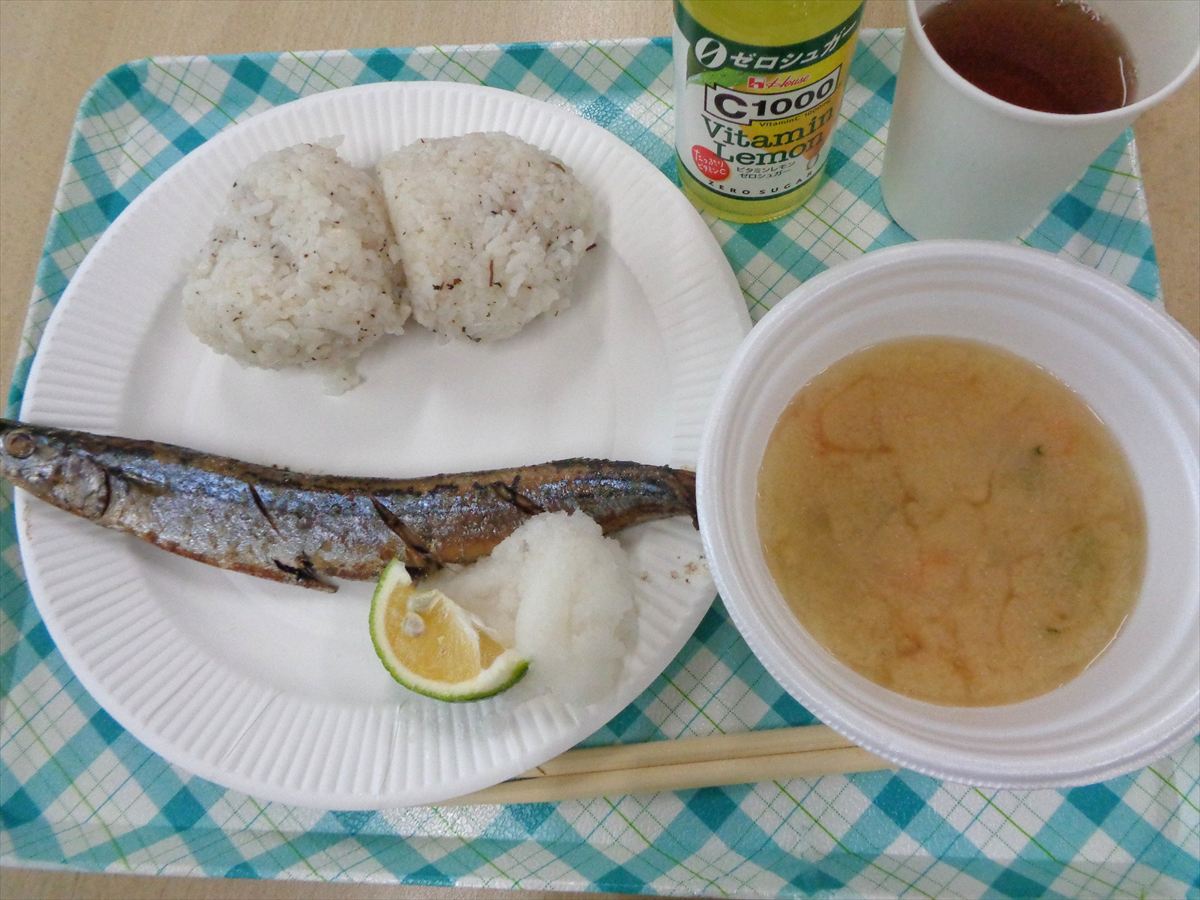 秋らしく「秋さんまの塩焼き、ゆかりおにぎり、味噌汁」