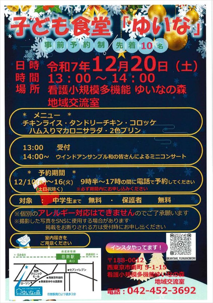 次回の子ども食堂『ゆいな』は、12/20(土)13:00~開催予定です。 メニューはチキンライス・タンドリーチキン・コロッケ・ハム入りマカロニサラダ・2色プリンです。 ご予約はお電話にて12/10(水)~16(火)の9:30~17:00にお願いします。 たくさんの方のお越しをお待ちしております。
