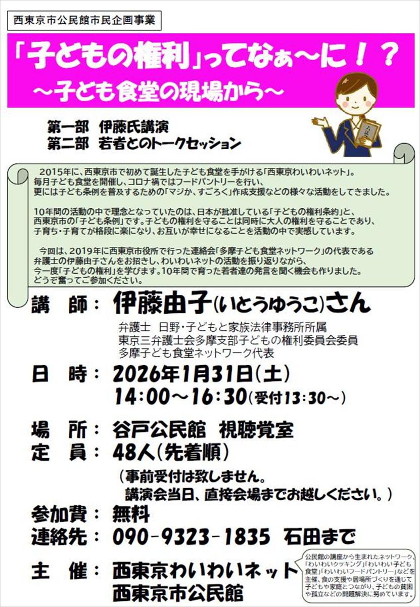 本講座では、西東京市に子ども食堂がスタートしたころから、 多摩地域で子ども食堂交流会を開く中心となっていた伊藤由子弁護士の講演と、 子ども食堂に関わってきた若者の発言で「子どもの権利」について考えます。