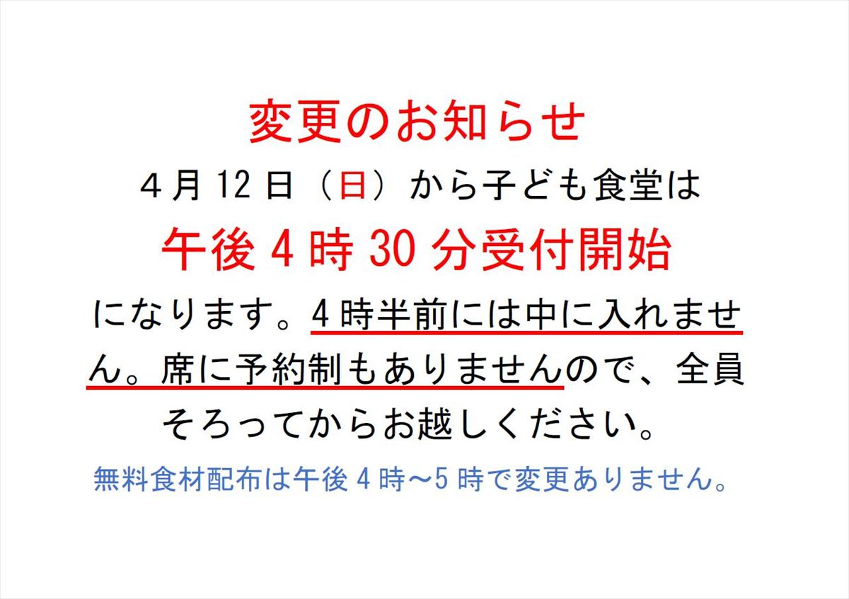 ※4月より子ども食堂の受付は4時30分より開始です。4時30分前は中に入れません。