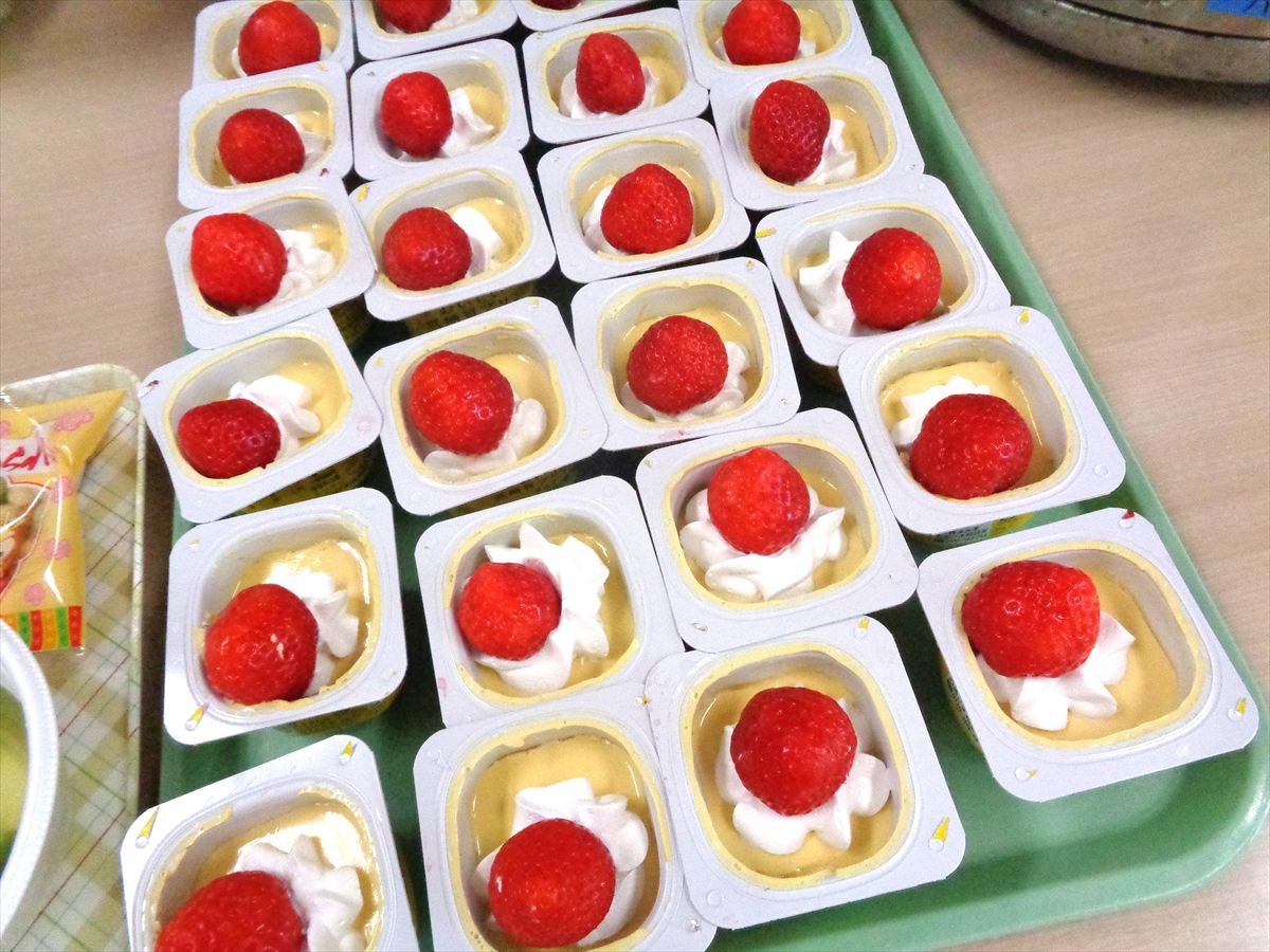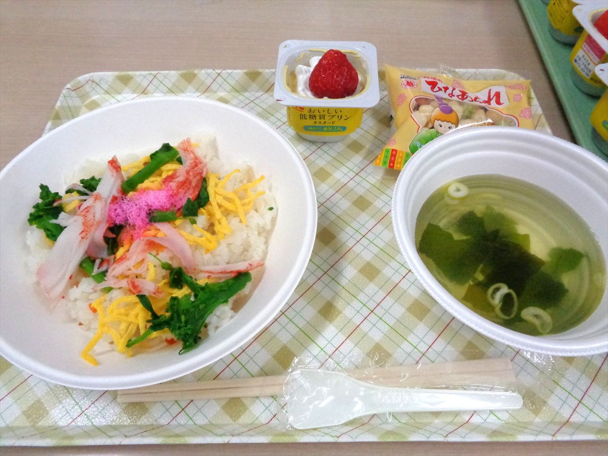 お食事は「ちらし寿司、すまし汁、いちごのデザート、ひなあられ」を50食ご用意させていただきました。