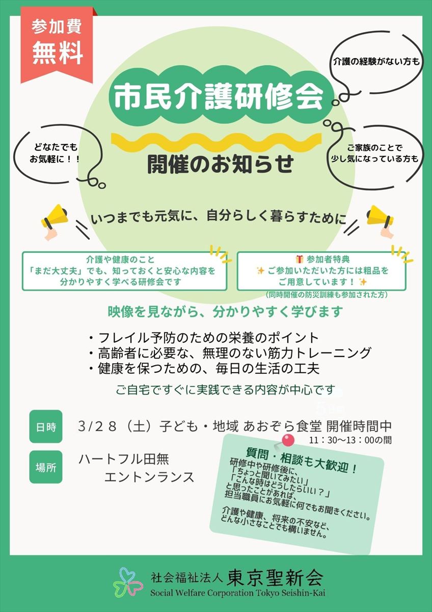 11時30分~「市民介護研修」と「こども・地域あおぞら食堂」を同時開催いたします。