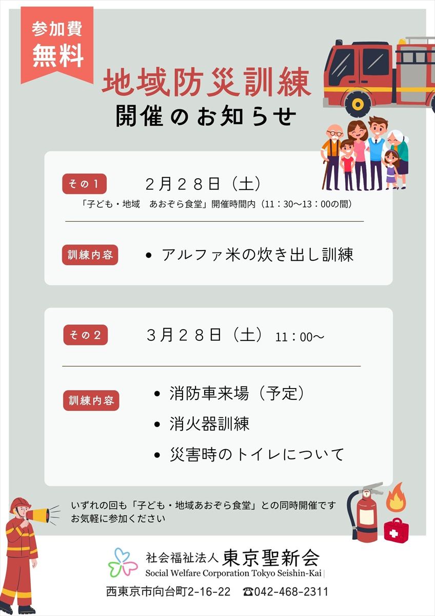 次回は3月28日(土)11時~「地域防災訓練」消防車が来る予定です。