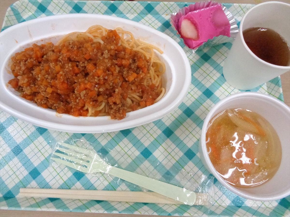 食事は「スパゲティミートソース、コンソメスープ、いちごミルクかん」50食をご用意させていただき、