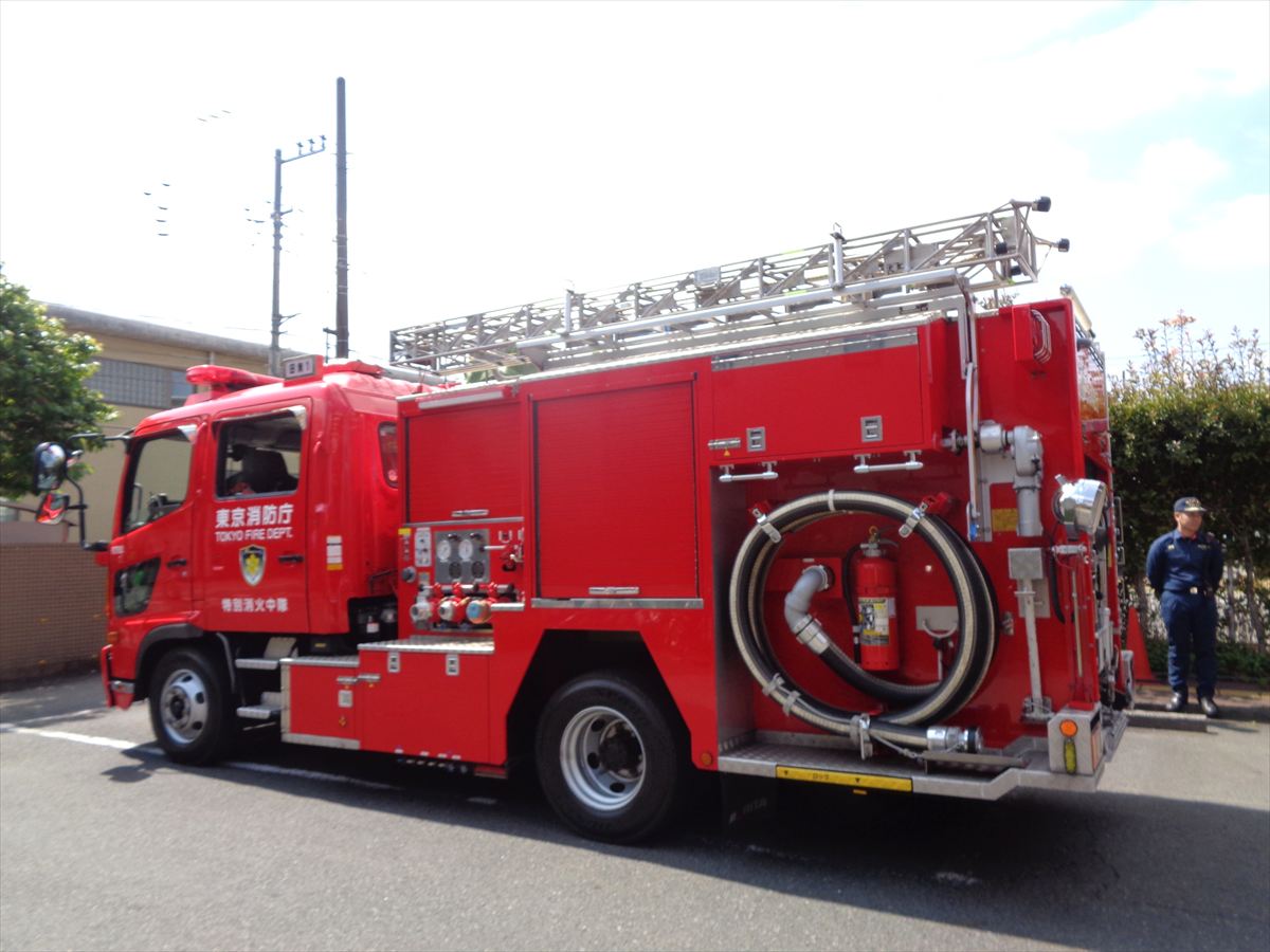 まずは、11時に消防車が到着し、「地域防災訓練」として西東京市第一団消防隊による消防車の説明や、